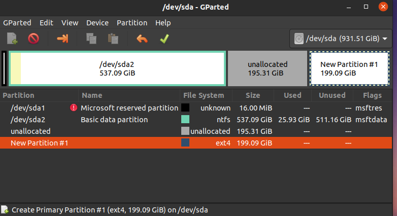 gparted에서 할당 되지 않은 저장공간에 오른쪽을 클릭하여 new를 눌러주고,