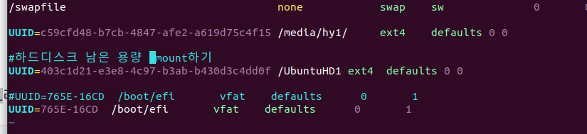 마운트 정보를 etc/fstab 파일에 추가해줘야 합니다. 저는 vim으로 작업했습니다.