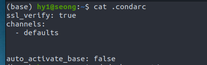 home의 .condarc를 보면 하단 부분에 auto_activate_base: fasle라고 되어있는것을 볼 수 있습니다.(적용됨)