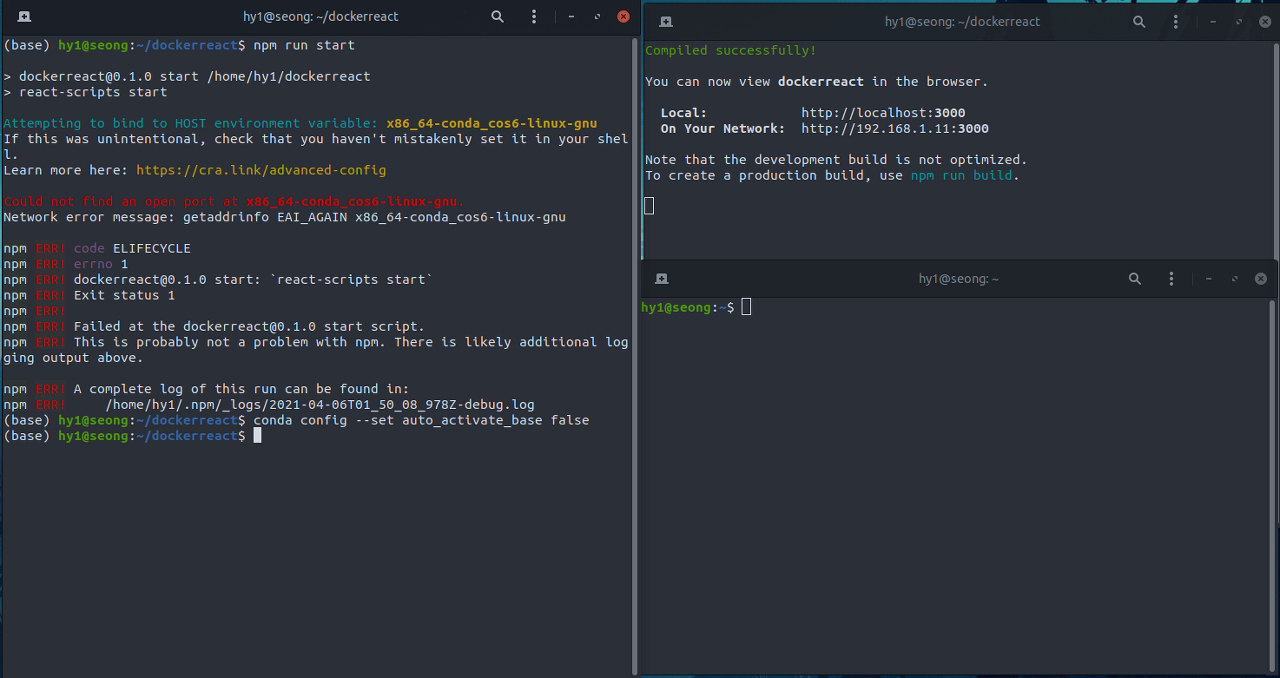 npm run start error anaconda:environmental variable ubuntu20.04 :Attempting to bind to HOST environment variable x86_64-conda_co
