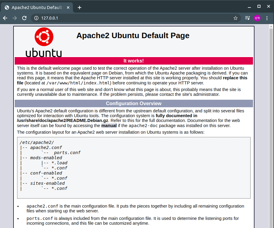 그리고 아파치가 잘 설치되었다면 로컬호스트로 접속했을 때 아래와 같은 화면이 뜹니다.