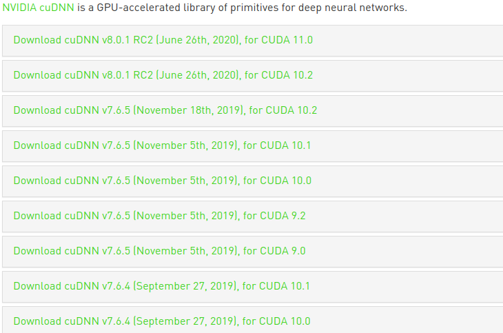 cuDNN 7.6.5 버전을 다운받아줍니다. CUDA버젼에 따라 호환되는 cuDNN 버전이 다릅니다.