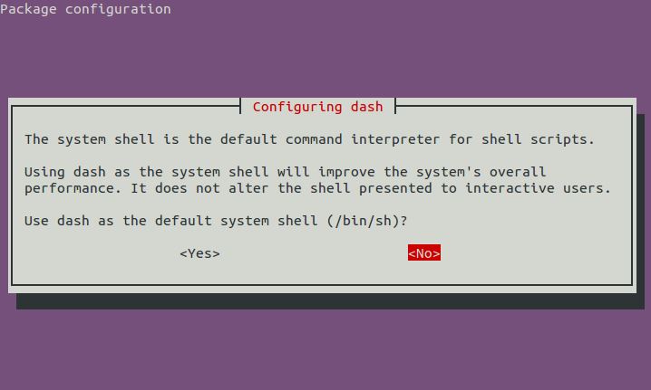 보이는 화면에서 no를 선택해주세요.(dash를 기본 쉘로 쓸 것인가에 묻는 질문입니다.)