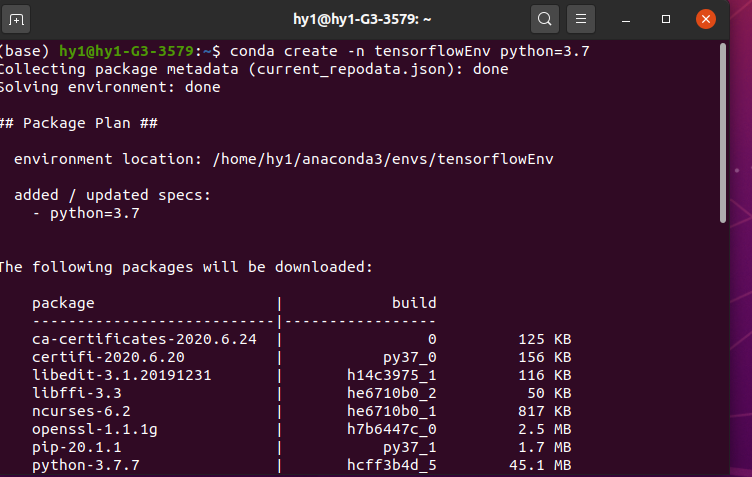 여기서 tensorflowEnv라는 이름의 환경을 만들었고 파이썬 환경은 3.7로 만든다 라는 의미입니다.