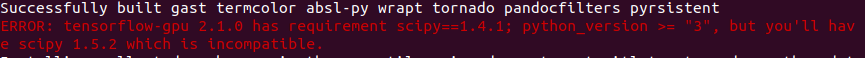 tensorflow 2.1가 scipy 패키지가 호환이 되지 않아 설치중 오류 메시지가 떴습니다.